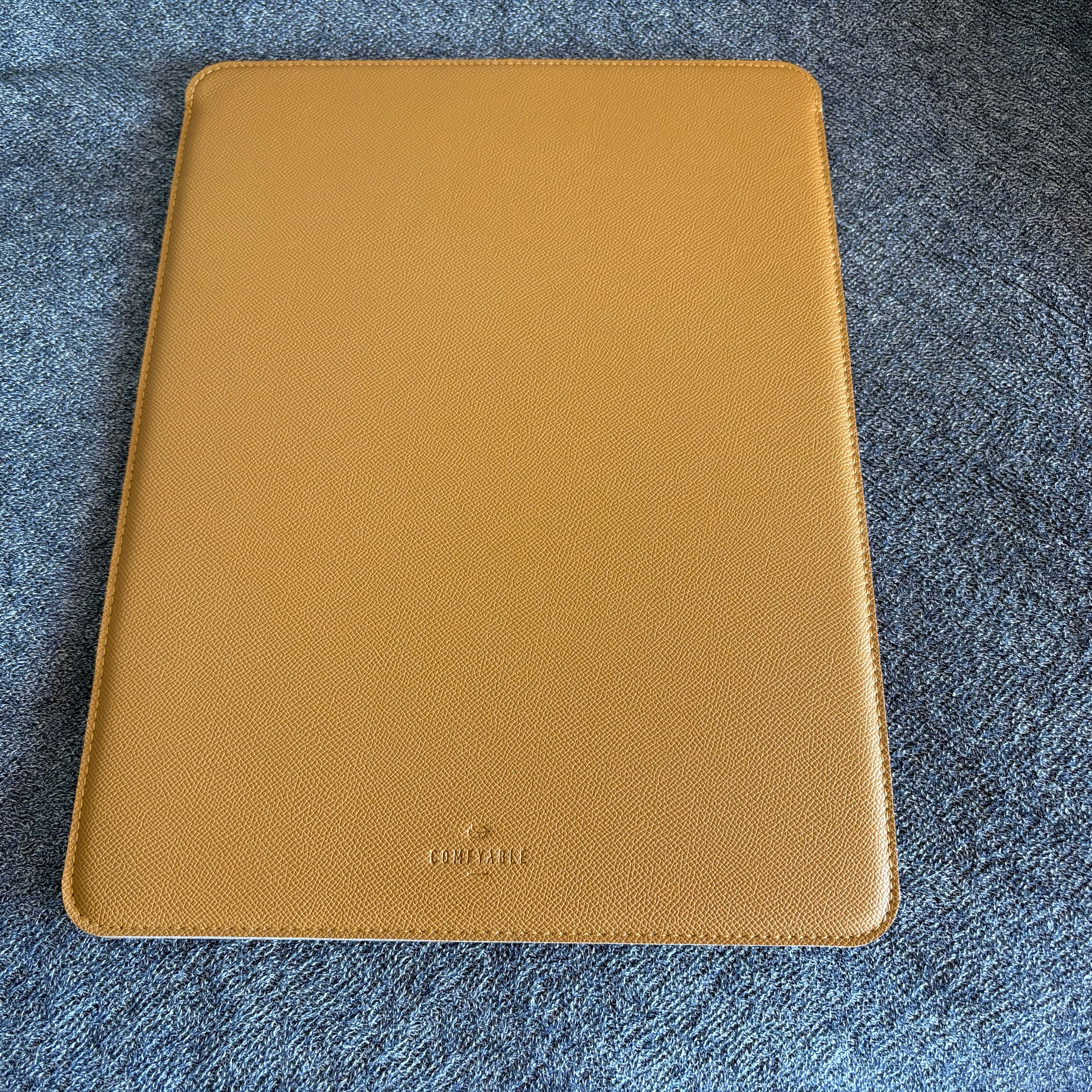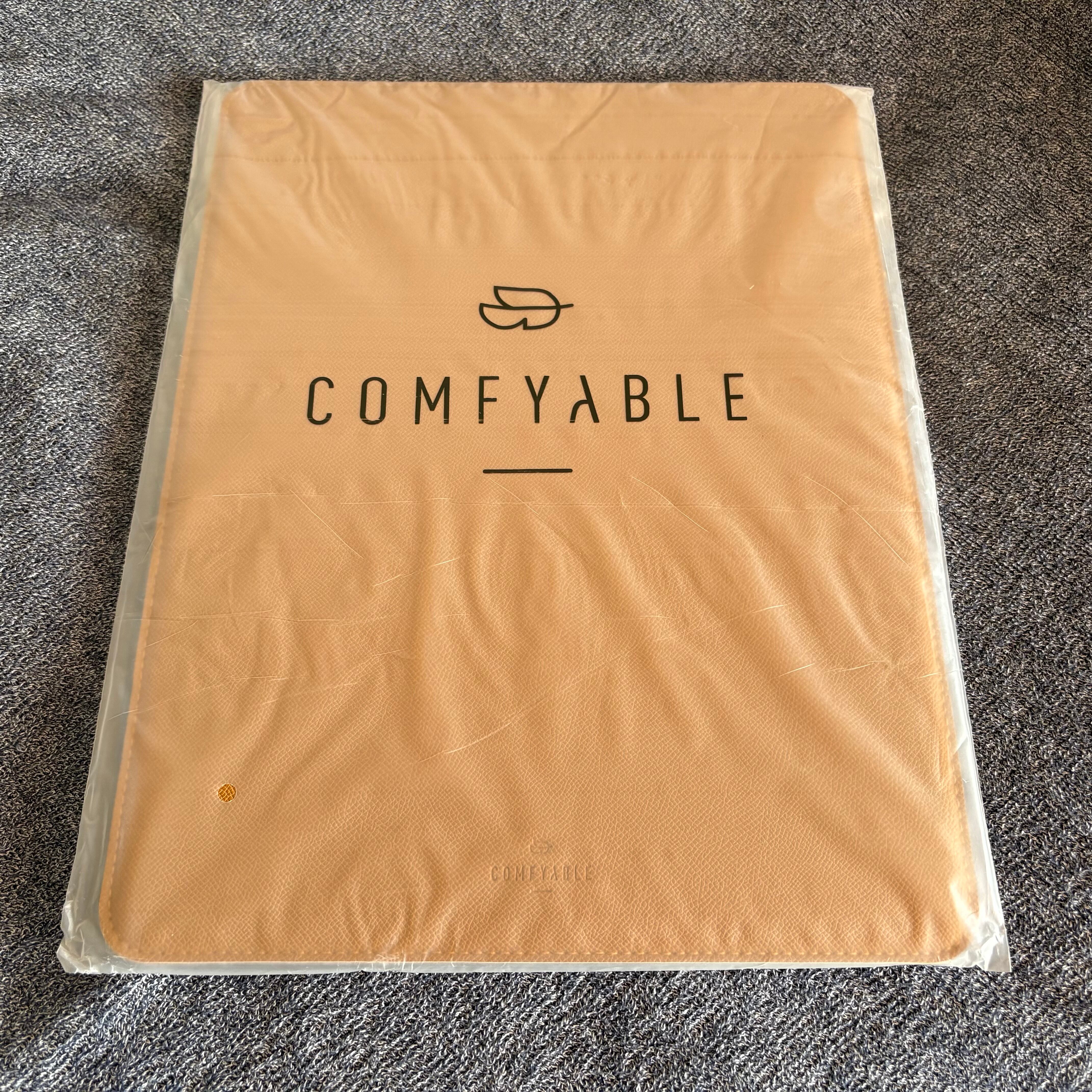 ブラウンのCOMFYABLEノートPCスリーブケース、シンプルでスタイリッシュなデザイン。
